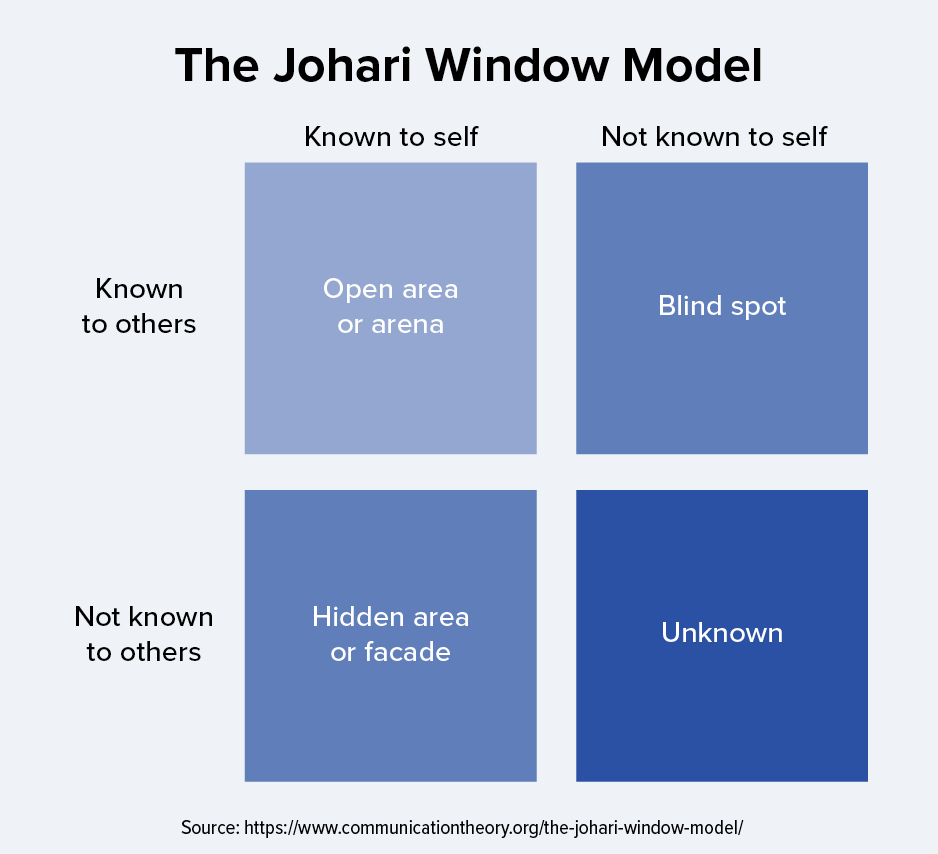 To visualize this, picture the Johari Window: It shows four categories of knowledge, from the things you know about yourself that others also know about you to the things that neither you nor those around you are aware of. If you can spend time trying to shed light on this unknown category, you will learn and grow so much more.